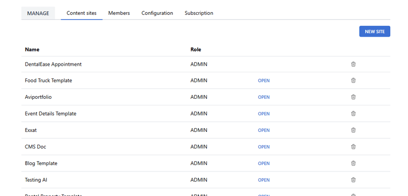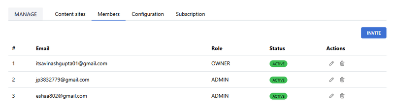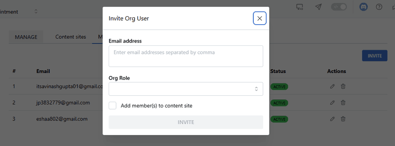 ADMIN: Permissions: Create sites, invite members (except Owners), and assign roles. Limitations: Cannot access billing details or delete the organization. Use Case: A project manager coordinating multiple teams.